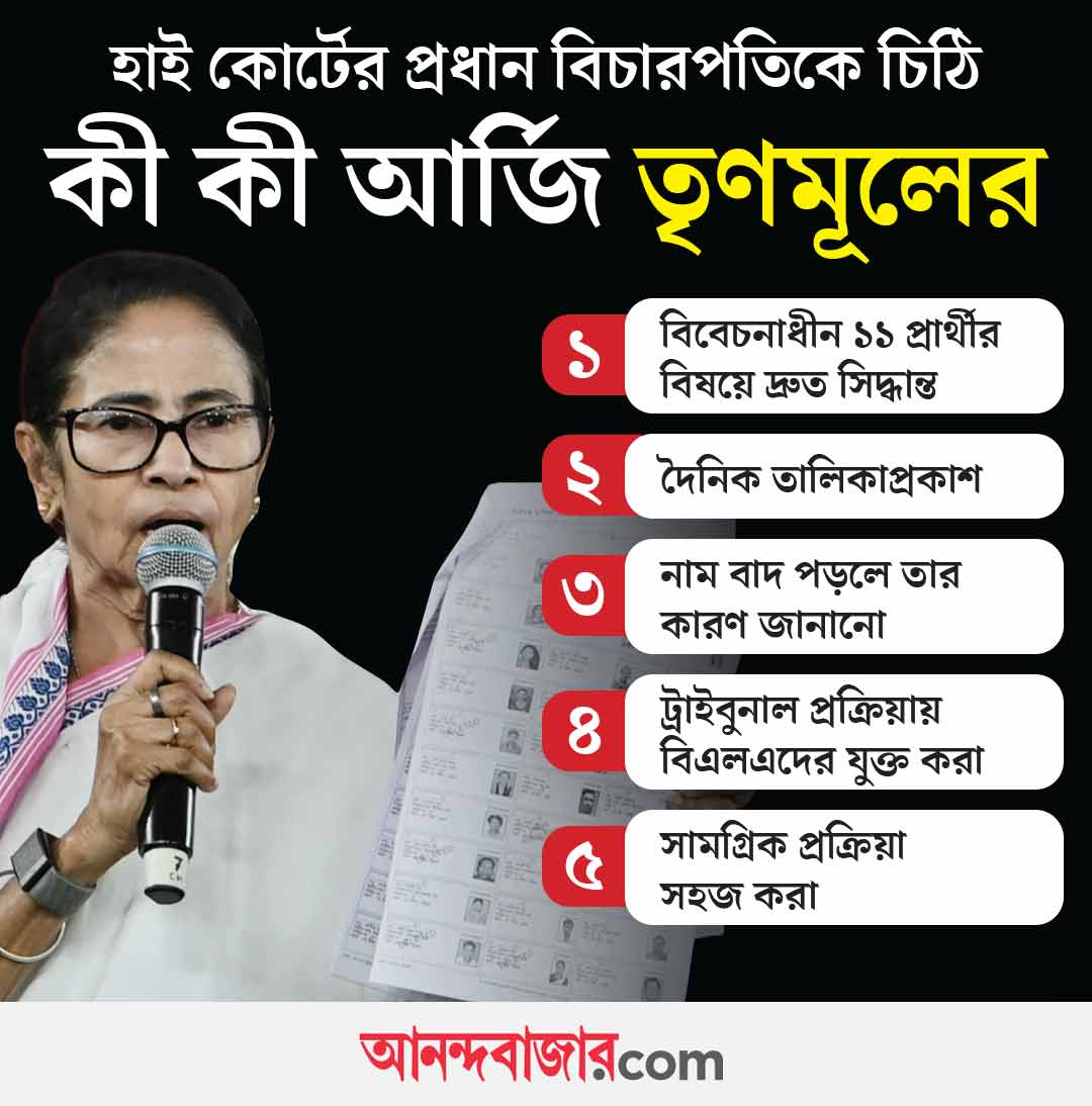 শাসকদলের তরফে আরও কয়েকটি আর্জি জানানো হয়েছে হাই কোর্টের প্রধান বিচারপতির কাছে। প্রথমত, বিবেচনাধীন তালিকার কত নিষ্পত্তি হচ্ছে, তার দৈনিক তালিকা প্রকাশ করা হোক। এ ব্যাপারে কমিশনকে নির্দেশ দিন প্রধান বিচারপতি। দ্বিতীয়ত, যাঁদের নাম বাদ পড়ছে, কেন তাঁদের নাম বাদ পড়ল, তা জানাক নির্বাচন কমিশন। তৃতীয়ত, যাঁদের নাম বাদ পড়ছে, তাঁদের আবেদন করার প্রক্রিয়া সহজ করা হোক। যাতে ‘ইসিআইএনইটি’ পোর্টালে আবেদন করা যায়, তার সংস্থান করা হোক। বাদ-পড়াদের আবেদন জানানোর প্রক্রিয়ায় বিএলএ-দের যুক্ত করার আর্জিও রয়েছে তৃণমূলের চিঠিতে।