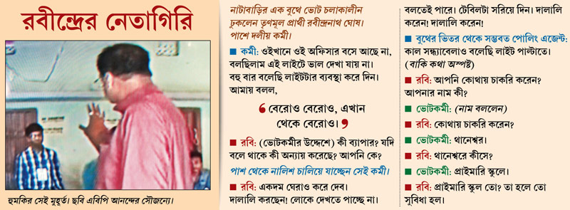 রবীন্দ্রনাথবাবু ও উদয়নবাবু কিন্তু দিনটা শুরু করেছিলেন খোশমেজাজেই। বেলা ১০টা বাজতেই হোঁচট খাওয়া শুরু। রবিবাবু খবর পান, নাটাবাড়িতে বুথের অদূরের ক্যাম্প অফিস ভেঙে দিয়েছে পুলিশ ও কেন্দ্রীয় বাহিনী। একের পর এক বুথ থেকে তৃণমূল কর্মীদের সরিয়ে দেওয়া হচ্ছে। কোথাও তাড়া করছে পুলিশ। তৃণমূল সূত্রেই জানা গিয়েছে, ঘনঘন ফোন পেয়ে রবিবাবু বাতানুকূল গাড়িতে বসেও ঘামতে শুরু করেন। গাড়িতে বসে নানা নির্দেশ দিতে থাকেন। তাতে কাজ না হওয়ায় নিজে ছোটাছুটি শুরু করেন। কিন্তু কর্মীদের চাঙ্গা করার কোনও উপায় বাতলাতে না পারায় কয়েক জন তো নেতার ভূমিকা নিয়েই প্রশ্ন তুলে ফেলেন। তারই পরিণতিতে চিলাখানার একটি বুথে গিয়ে নিজের একান্ত অনুগামী মহিদুল ইসলামের ‘রবিদা কিছু করুন’ বলে চেঁচামেচি শুনে তাঁকে সপাটে চড় কষিয়ে দেন। একই সময়ে খেই হারিয়ে ফেললেন উদয়নও। কোথাও কেন্দ্রীয় বাহিনীর ভূমিকা নিয়ে হইচই বাঁধিয়ে ফেলেন। পুলিশকে ধমক-ধামক দিলেন। একটা সময়ে ১২৩ নম্বর বুথে সটান ভিতরে ঢুকে ঘেরাটোপের মধ্যে থাকা ভোটযন্ত্রের সামনেই হাজির হয়ে গেলেন তিনি।
