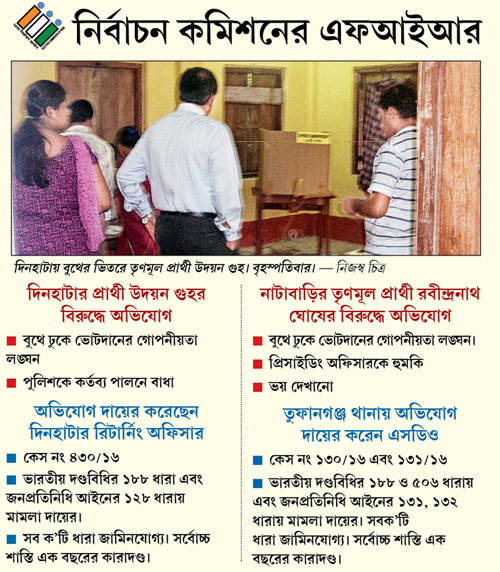 রবিবাবুর অবশ্য বক্তব্য, ‘‘চড় মারা নিয়ে বিতর্কে বাইরের লোক ঢুকছেন কেন? এ তো আমাদের নিজেদের ব্যাপার।’’ তাঁর বরং অভিযোগ, ‘‘আধা সামরিক বাহিনীর জওয়ানরা নানা জায়গায় সন্ত্রাস তৈরি করার চেষ্টা করে। বেআইনি ভাবে আমাদের অনেক বুথ ক্যাম্প ভাঙচুর করা হয়। নির্বাচন কমিশনে অভিযোগ জানিয়েছি।” আর উদয়নের যুক্তি, ‘‘এক দৃষ্টিহীন মহিলাকে তাঁর নাতি ভোট দেওয়ার জন্য বুথে নিয়ে যান। সেই সময় আমি বুথের খোঁজখবর নিচ্ছিলাম। ছাপ্পার অভিযোগ বানানো।”