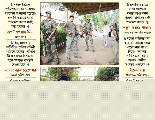 জেলা পুলিশের এক কর্তার কথায়, “ভোটের পরে জেলায় বড় কোনও অশান্তি হয়নি। কোথাও কোথাও সামান্য গোলমাল হয়েছে। তবে দেখা গিয়েছে, সেই গোলমাল থামানোর জন্যও সব রাজনৈতিক দল সচেষ্ট ছিল।” জেলা প্রশাসনের এক কর্তাও বলেন, “যে কোনও জায়গাতেই গোলমাল থামানোর ক্ষেত্রে রাজনৈতিক দলগুলোর একটা ভূমিকা থাকে। নেতৃত্বের কথা অনেকে শোনেন। আশা করি, ভোটের ফলপ্রকাশের পরও জেলায় তেমন অশান্তি হবে না। সর্বত্রই শান্তিশৃঙ্খলা বজায় থাকবে।”