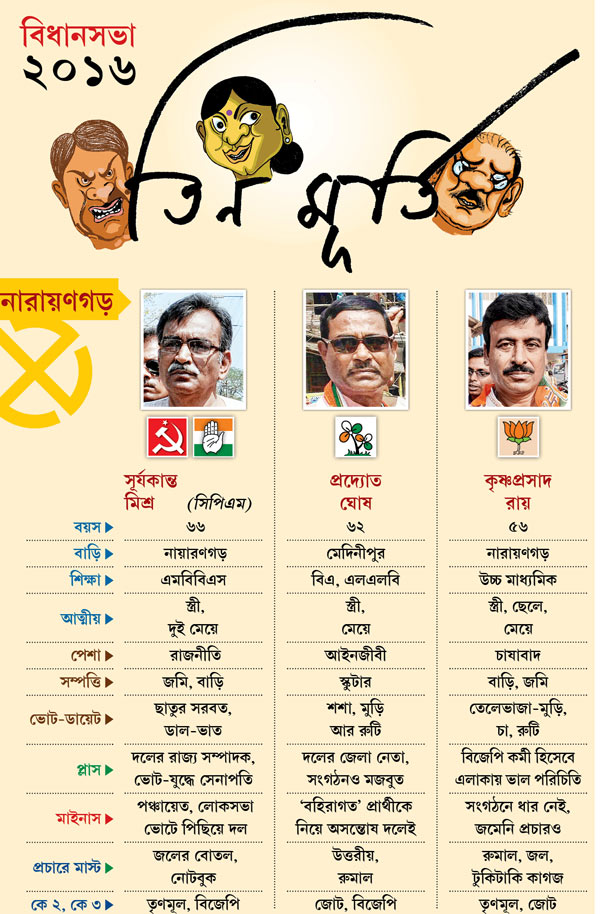 উনি মানে সূর্যকান্ত মিশ্রের সামনে সুযোগ ছিল। কিন্তু যুদ্ধের জন্য নিরাপদ প্রান্তর বেছে নিতে তিনি অস্বীকার করেছেন। প্রথা ভেঙে ভোটে দাঁড় করিয়ে সিপিএম তার রাজ্য সম্পাদককে এগিয়ে দিয়েছে অরক্ষিত এক ময়দানে। যেখানে অভিষেক বন্দ্যোপাধ্যায় থেকে শুভেন্দু অধিকারী বারেবারে শুনিয়ে যাচ্ছেন, ৫০ হাজারে হারাব এ বার। পাল্টা কোমর বেঁধেছেন তরুণ রায়েরাও। তাঁরা জানেন, রাজ্য সম্পাদক লড়ছেন মানে গোটা সিপিএমের ইজ্জতের লড়াই। নারায়ণগড় আসলে এখানে স্রেফ ঘটনাচক্র। একটা জায়গার নাম শুধু। লড়াইটা কিন্তু হচ্ছে গোটা রাজ্যের ক্যানভাসে।