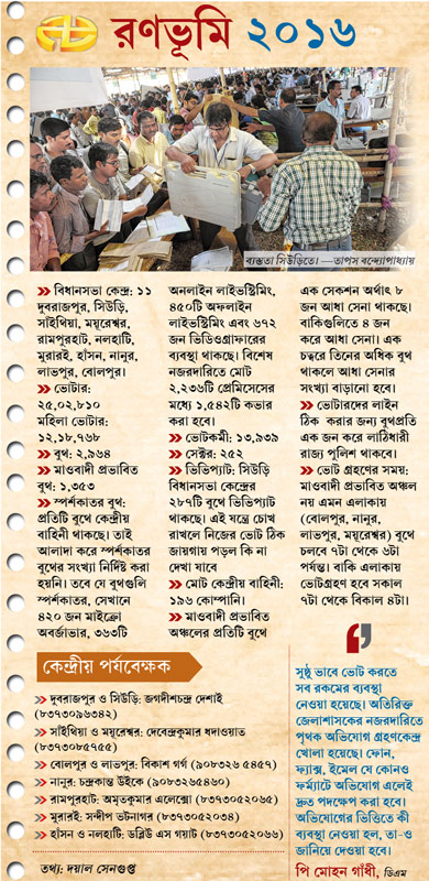 কমিশন, কেন্দ্রীয় বাহিনী, সংবাদমাধ্যম, নজরবন্দি— এ সব কিছু থাকা সত্ত্বেও,‘দাদা’ অনুব্রত মণ্ডলের সেই নির্দেশ যে অক্ষরে অক্ষরে পালন করা শুরু হয়ে গিয়েছে জেলায় টের পেলেন বিরোধীরা। শুক্রবার থেকেই কোথাও প্রকাশ্য প্রচার সভায় চলছে হুমকি, তো কোথাও বিরোধীদের পোস্টার ছিড়ে, কর্মী-সমর্থকদের মারধরের অভিযোগ উঠল শাসকদল তৃণমূলের বিরুদ্ধে। এ চিত্র বীরভূমের। ‘অপারশেন’ যে এ দিনও হবে, তার ইঙ্গিত মিলল নানুরে দলের পার্টি অফিসে বসে। সে কথাই শোনা গেল কেষ্টর দশাননের এক মুখ থেকে। বললেন, ‘‘যা হওয়ার হয়ে যাবে। সকাল ১০ টার ভেতরেই। আমরা দলের কর্মী-সমর্থকদের সে কথাই জানিয়ে দিয়েছি।’’