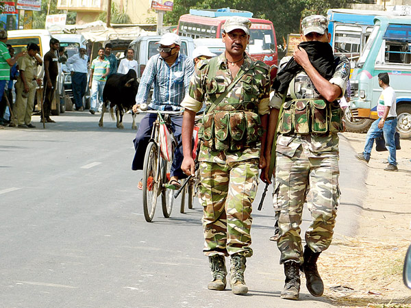 কালনা শহরে কেন্দ্রীয় বাহিনীর টহল। বুধবার তোলা নিজস্ব চিত্র।