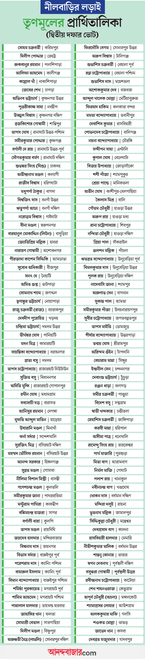 যে সব বিধায়কের কেন্দ্রবদল হয়েছে তাঁদের মধ্যে রয়েছেন শওকত মোল্লা (ক্যানিং পূর্ব থেকে ভাঙড়), রানা চট্টোপাধ্যায় (বালি থেকে শিবপুর), রত্না চট্টোপাধ্যায় (বেহালা পূর্ব থেকে বেহালা পশ্চিম), প্রাক্তন পুলিশকর্তা হুমায়ুন কবীর (ডেবরা থেকে ডোমকল), বিদেশ বসু (উলুবেড়িয়া পূর্ব থেকে সপ্তগ্রাম), সোহম চক্রবর্তী (চণ্ডীপুর থেকে করিমপুর) এবং রুকবানুর রহমান (চাপড়া থেকে পলাশিপাড়া)। মোট দেড়শো জন বিধায়কের প্রার্থিতালিকায় প্রত্যাবর্তন ঘটেছে। এঁদের মধ্যে ১৩৫ জনকে তাঁদের পুরনো আসনে প্রার্থী করা হয়েছে। অর্থাৎ, ৬০ শতাংশ বিধায়কের কেন্দ্রবদল হয়নি।