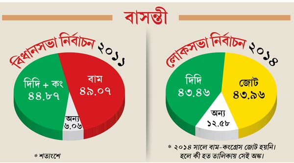 বিধানসভা পরে লোকসভা— জয়ের ব্যবধান ক্রমশ নেমেছে। তবুও জোটপ্রার্থী আশাবাদী। দক্ষিণ ২৪ পরগনার বাসন্তী বিধানসভা কেন্দ্র। জোটের ভোট বিন্যাস অনুযায়ী, নামেই জোট প্রার্থী। বাসন্তী বিধানসভায় সিপিএম ও কংগ্রেসের ভোটের হার শতাংশ না ভগ্নাংশ সেই বিষয়ে হিসেব করলে বিভ্রান্ত হবে যে কেউ-ই। জোট নয়। মূলত লড়াই আরএসপি বনাম তৃণমূল।
