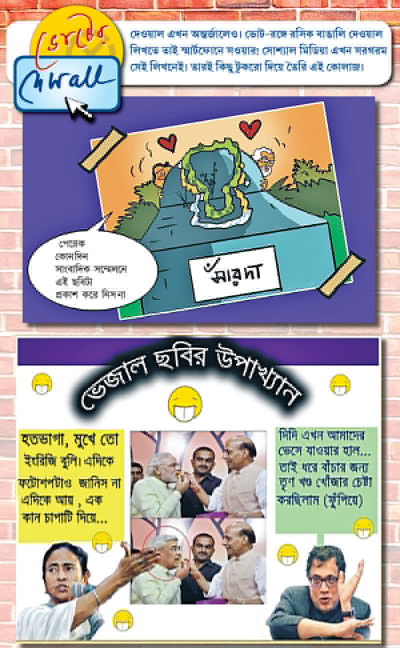 দেওয়াল এখন অন্তর্জালেও। ভোট-রঙ্গে রসিক বাঙালি দেওয়াল লিখতে তাই স্মার্টফোনে সওয়ার! সোশ্যাল মিডিয়া এখন সরগরম সেই লিখনেই। তারই কিছু টুকরো দিয়ে তৈরি এই কোলাজ।দেওয়াল এখন অন্তর্জালেও। ভোট-রঙ্গে রসিক বাঙালি দেওয়াল লিখতে তাই স্মার্টফোনে সওয়ার! সোশ্যাল মিডিয়া এখন সরগরম সেই লিখনেই। তারই কিছু টুকরো দিয়ে তৈরি এই কোলাজ।