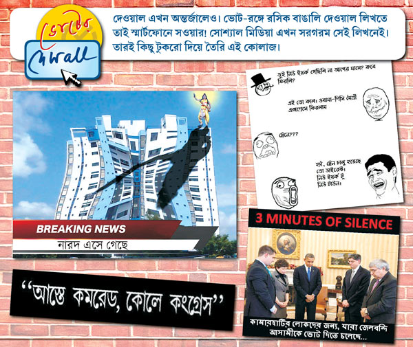 দেওয়াল এখন অন্তর্জালেও। ভোট-রঙ্গে রসিক বাঙালি দেওয়াল লিখতে তাই স্মার্টফোনে সওয়ার! সোশ্যাল মিডিয়া এখন সরগরম সেই লিখনেই। তারই কিছু টুকরো দিয়ে তৈরি এই কোলাজ।
