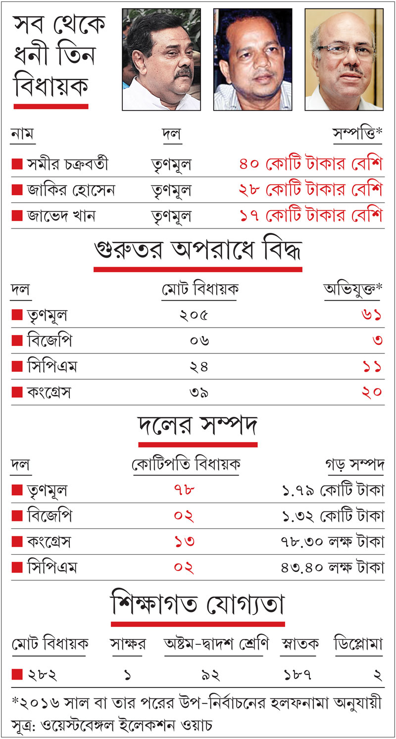 রাজ্যের ধনী বিধায়কদের ক্ষেত্রে প্রথম তিনটি স্থানেই রয়েছেন তৃণমূল প্রতিনিধিরা। বাঁকুড়ার তালড্যাংরার বিধায়ক সমীর চক্রবর্তী, মুর্শিদাবাদের জঙ্গিপুরের বিধায়ক জাকির হোসেন এবং কলকাতার কসবার বিধায়ক জাভেদ খান। রাজনৈতিক সূত্রের খবর, ওই তিন জনই পেশাগত ভাবে প্রতিষ্ঠিত ব্যবসায়ী। সব থেকে কম সম্পত্তি রয়েছে, এমন তিন বিধায়কের তালিকায় একমাত্র তৃণমূল প্রতিনিধি নবদ্বীপের বিধায়ক পুণ্ডরীকাক্ষ সাহা। বাকি দু’জন সিপিএমের, পাঁশকুড়ার বিধায়ক শেখ ইব্রাহিম আলি এবং সোনামুখীর বিধায়ক অজিত রায়। শতাংশের নিরিখে ধনীর তালিকায় যুগ্ম ভাবে দ্বিতীয় বিজেপি এবং কংগ্রেস। হলফনামা বিশ্লেষণ করে জানানো হয়েছে, তৃণমূল বিধায়কদের মাথাপিছু গড় সম্পত্তির পরিমাণ এক কোটি ৭৯ লক্ষ টাকা। বিজেপি বিধায়কদের মাথাপিছু গড় সম্পত্তির পরিমাণ এক কোটি ৩২ লক্ষ টাকা। ধনসম্পত্তির পরিমাণে সব থেকে নীচে রয়েছেন পাঁশকুড়ার সিপিএম বিধায়ক শেখ ইব্রাহিম আলি।
