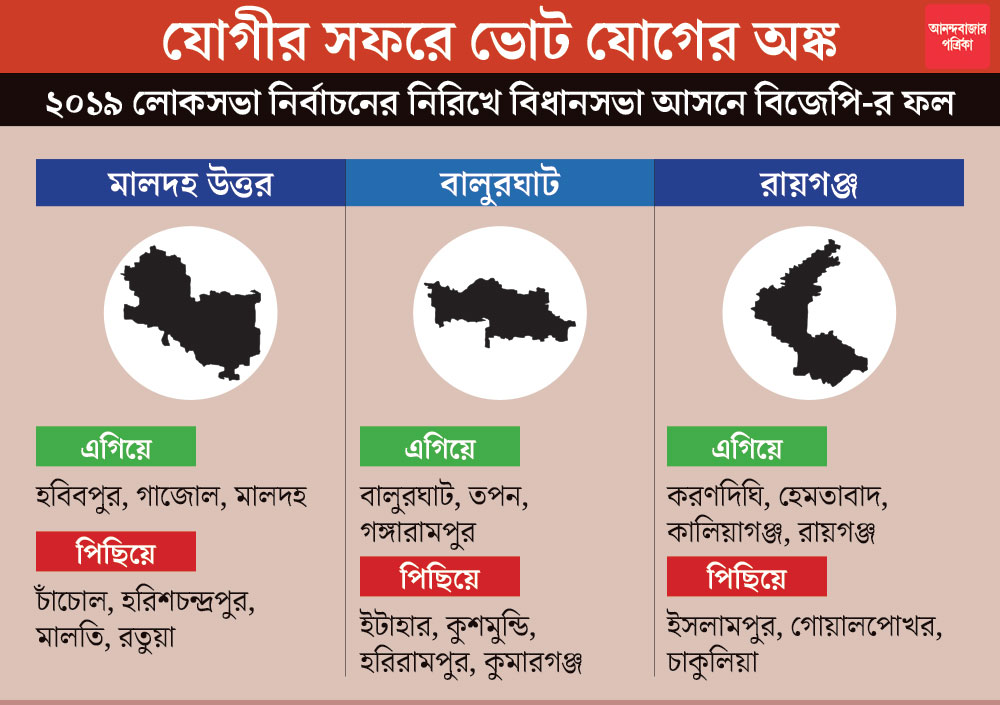 মালদহ উত্তরে ৮৪,২৮৮ ভোটে জয় পেয়েছিলেন বিজেপি-র খগেন। বিধানসভা কেন্দ্রের হিসাব করলে বিজেপি এগিয়ে রয়েছে ওই লোকসভার অন্তর্গত হবিবপুর, গাজল, মালদহ আসনে। অন্য দিকে, তৃণমূল বিজেপি-র তুলনায় এগিয়ে রয়েছে চারটি আসনে— চাঁচল, হরিশচন্দ্রপুর, মালতিপুর এবং রতুয়া। প্রসঙ্গত ওই চারটি আসনে মুসলিম ভোট যথাক্রমে ৭০, ৭২, ৭২ এবং ৬৬ শতাংশের আশপাশে। একই চিত্র দক্ষিণ দিনাজপুরের বালুরঘাট লোকসভা এলাকায়। সেখানে বিজেপি-র সুকান্ত মজুমদার জয় পান ৩৩,২৯৩ ভোটের ব্যবধানে। সেই হিসাবমতো বিজেপি ওই এলাকার তিনটি বিধানসভা আসন বালুরঘাট, তপন ও গঙ্গারামপুরে এগিয়ে রয়েছে। পক্ষান্তরে, ওই লোকসভা আসনে তৃণমূল এগিয়ে চারটি বিধানসভা এলাকায়— ইটাহার, কুশমুন্ডি, হরিরামপুর এবং কুমারগঞ্জ। ওই চারটি আসনের মধ্য প্রথম তিনটিতে মুসলিম ভোটার যথাক্রমে ৫০, ৪০ এবং ৪৯ শতাংশের আশপাশে। রায়গঞ্জ লোকসভা আসনে বিজেপি-র দেবশ্রী চৌধুরী জেতেন ৬০,৫৭৪ ভোটের ব্যবধানে। শেখানেও বিজেপি এগিয়ে চারটি বিধানসভা এলাকায়। করণদিঘি, হেমতাবাদ, কালিয়াগঞ্জ এবং রায়গঞ্জ। তৃণমূল এগিয়ে ইসলামপুর, গোয়ালপোখর, চাকুলিয়া বিধানসভা এলাকায়। ওই তিনটি আসনে মুসলিম ভোটার যথাক্রমে ৭২, ৭০, ৭১ শতাংশ। বাকি আসনগুলিতে মোটামুটি ৫০ শতাংশ।