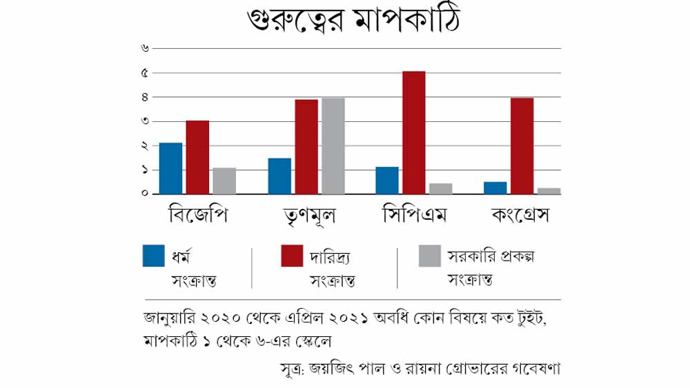 গবেষণাপত্রে দেখানো হয়েছে, তৃণমূলের প্রচারে একটা বড় অংশ জুড়ে থেকেছে সরকারি প্রকল্পের কথা। জানুয়ারি ২০২০ থেকে এপ্রিল ২০২১ পর্যন্ত নানা দলের নেতারা কী কী বিষয়ে টুইট করেছেন তার তুলনামূলক বিশ্লেষণ করে গবেষকেরা দেখিয়েছেন তৃণমূল নেতারা অন্য দলের কথা বলার চেয়ে নিজেদের সরকারের নানা প্রকল্পের বিষয়ে বেশি টুইট করেছেন। কংগ্রেস ও সিপিএমের টুইটে বেশি করে এসেছে দারিদ্রের প্রসঙ্গ। সিপিএমের প্রচারে ‘ছাত্র’, ‘শ্রমিক’, ‘প্রতিবাদ’ এই ধরনের শব্দ বেশি ব্যবহার হয়েছে। ধর্মীয় প্রসঙ্গ, দেবদেবীর নাম, ধর্মীয় উৎসবের শুভেচ্ছা ইত্যাদি অন্যদের তুলনায় বেশি ব্যবহার করেছে বিজেপি।
