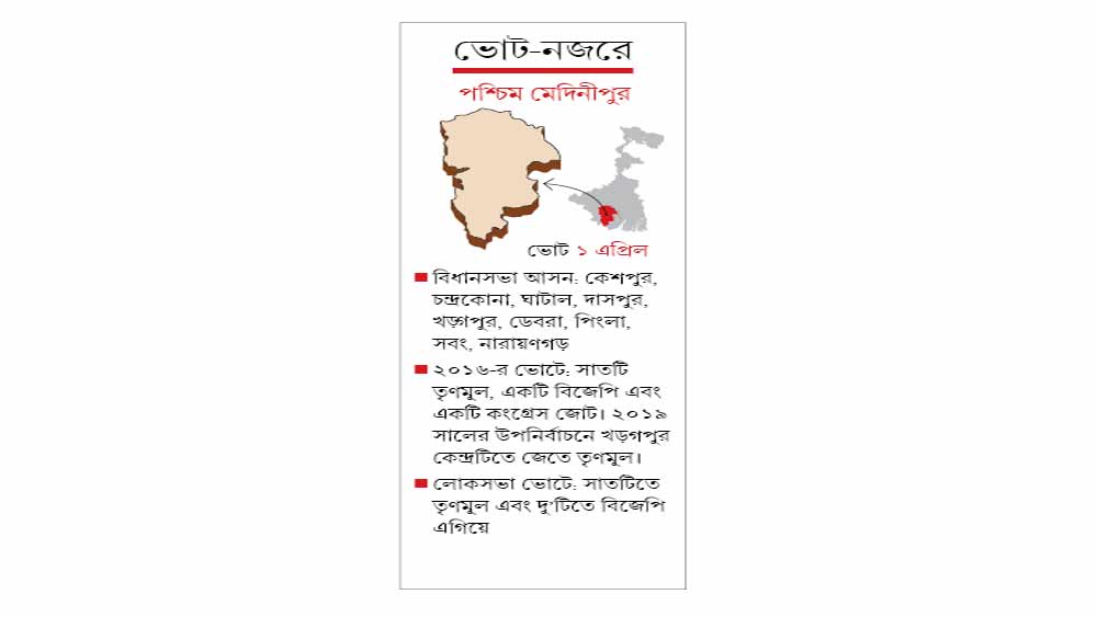 সবংয়ের তৃণমূলের প্রার্থী ভূমিপুত্র মানস ভুঁইয়া। আসমুদ্র-হিমাচল বঙ্গের মানুষ তাঁকে এক নামে চেনে। চষে ফেলছেন গ্রাম থেকে গ্রামান্তর। কলসবাড়ে সামিয়ানার তলায় দাঁড়িয়ে শোনাচ্ছিলেন তাঁর ৪২ বছরের রাজনৈতিক কর্মজীবনের কাহিনি। দূরে দাঁড়িয়ে স্থানীয় সপ্রতিভ যুবকের ফিসফিসানি, ‘‘নিচুতলার নেতাদের বিরুদ্ধে দুর্ব্যবহারের অভিযোগ! জানি না কী হবে!’’ উল্টো দিকে, অমূল্য মাইতি সবে ঘাস ছেড়ে পদ্ম ধরেছেন। সবংয়ের বিষ্ণুপুর বাজারে বসে হতাশা শোনা গেল উৎপল ধারার গলায়, ‘‘এখানে কাজ কোথায়? থাকলে, বিপদে-আপদে আমাকে মহারাষ্ট্র থেকে ৩৬ ঘণ্টা উজিয়ে বাড়ি ফেরার কথা তো ভাবতে হত না।’’ জেলার তৃণমূল সভাপতি, পিংলার তৃণমূল প্রার্থী অজিত মাইতি-র কথায়, ‘‘এ সব বুঝিয়ে বিজেপি আপ্রাণ চেষ্টা চালাচ্ছে কয়েকটা আসন পাওয়ার। মানুষের ভরসা এখনও আমাদের সঙ্গে।’’