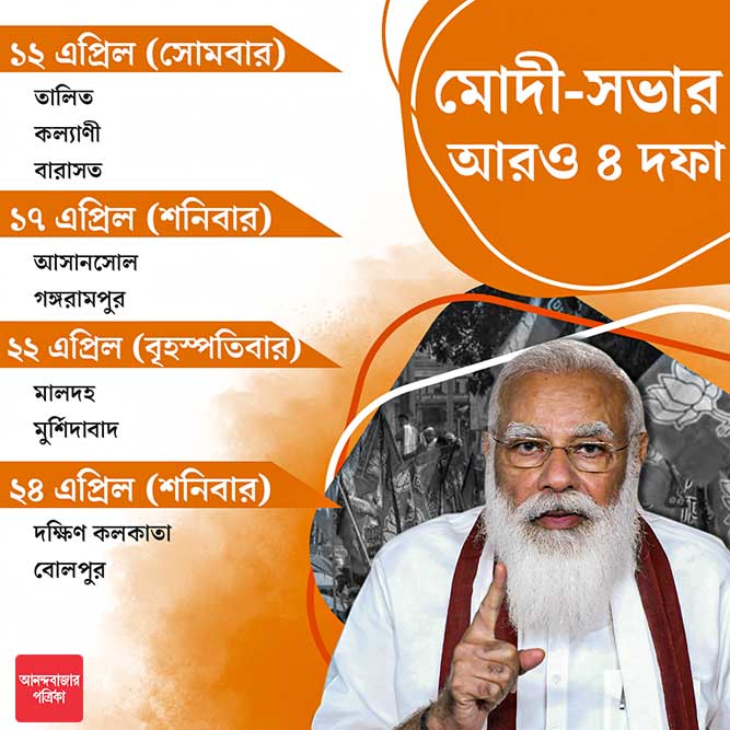 রাজ্য বিজেপি সূত্রে জানা গিয়েছে, বাকি যে ৪ দফার ভোটগ্রহণ রয়েছে, তার আগে মোট ৪ বার রাজ্যে আসবেন মোদী। সোমবারের ৩টি সভার পরে ১৭ এপ্রিল, শনিবার পঞ্চম দফার ভোটগ্রহণের দিনে তাঁর সমাবেশ হওয়ার কথা পশ্চিম বর্ধমানের আসানসোল এবং দক্ষিণ দিনাজপুরের গঙ্গারামপুরে। ২২ এপ্রিল, বৃহস্পতিবার ষষ্ঠ দফায় ভোটগ্রহণের দিনও দু’টি সভা হওয়ার কথা মালদহ এবং মুর্শিদাবাদে। তবে এখনও পর্যন্ত যা জানা গিয়েছে, তাতে সপ্তম দফার ভোটগ্রহণের দিনে রাজ্যে কোনও কর্মসূচি থাকছে না মোদীর। বিধানসভা নির্বাচনের প্রচারে তাঁর শেষ বাংলা সফর ২৪ এপ্রিল, শনিবার। সে দিন সভা হওয়ার কথা দক্ষিণ কলকাতা ও বোলপুরে।