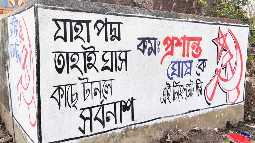 ছড়ার ছন্দে আর কৌশলী শব্দ চয়নে একে অপরকে ব্যঙ্গ করার ঐতিহ্য এ রাজ্যে বহু দিনের। এ বারেও ভোট এগিয়ে আসতেই নতুন-নতুন ছড়ায় ভরে উঠছে দেওয়াল। যেমন, বিজেপি ও তৃণমূলকে কটাক্ষ করে সিপিএম রানিগঞ্জের একাধিক দেওয়ালে লিখেছে, ‘যাহা পদ্ম তাহাই ঘাস, কাছে টানলে সর্বনাশ’। তেমনই রানিগঞ্জের একটি দেওয়ালে তৃণমূলের আহ্বান: ‘আমিও আছি, তুমিও রবে, এসো বন্ধু খেলা হবে’। পাল্টা বিঁধে বিজেপি-র দেওয়ালে লেখা: ‘মাঠে যখন নেমেছি, মন দিয়ে খেলব। একুশে বিজেপি, সরকার আমরাই গড়ব।’
