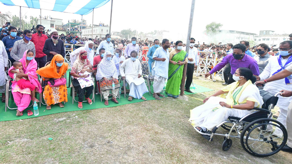ফারুক আর নাসেরের সামাজিক অবস্থানের মধ্যে সাযুজ্য খুব সামান্য। কিন্তু বিধানসভা নির্বাচনে রাজনৈতিক নেতা আর গণমাধ্যমের তাড়নায় তাঁরা আজ একই পঙক্তিতে। সমস্ত মুসলমানকে একটা একতরফা বর্গ হিসেবে দেখা শুরু হয়েছে। যেখানে স্থানীয় এবং বহিরাগত বিজেপি নেতাদের বিদ্বেষপূর্ণ, বিভাজনমূলক বক্তৃতা সংখ্যাগুরুর সামনে মুসলমানদের নির্বিচারে একটা ‘অন্যত্ব’য় পর্যবসিত করছে, সেখানে মমতা বন্দ্যোপাধ্যায় নিজেকে কিছুটা ‘রক্ষক’ ভাবমূর্তিতে নিয়ে আসতে সমর্থ হয়েছেন এবং তৃতীয় বারের জন্য ক্ষমতায় আসতে একটা ‘সম্মিলিত’ মুসলিম ভোটের উপর নির্ভর করছেন।