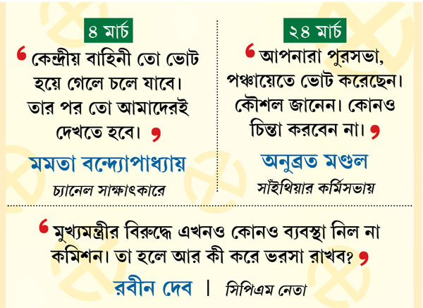 ভোট ঘোষণার আগেই শুরু হয়েছিল কেন্দ্রীয় বাহিনীর টহল। নির্বাচনের দিনক্ষণ জানানোর পরে কমিশনের ‘ফুল বেঞ্চ’ থেকে শুরু করে বিভিন্ন স্তরের পর্যবেক্ষকের আগমনে সরগরম রাজ্য। কিন্তু ভোটের দোরগোড়ায় এসে বিরোধীরা প্রশ্ন তুলছেন, এত কিছু করেও কাজের কাজ কতটা হচ্ছে? না হলে এ মাসের গোড়ায় প্রকারান্তরে হুঁশিয়ারি দেওয়ার পরেও এত দিনে মুখ্যমন্ত্রীর বিরুদ্ধে ব্যবস্থা নেওয়া হয়নি কেন? অনুব্রত মণ্ডলরাই বা ‘নিশ্চিন্তে ভোট করানো’ নিয়ে লাগাতার বক্তৃতা দিয়ে যাচ্ছেন কীসের জোরে?