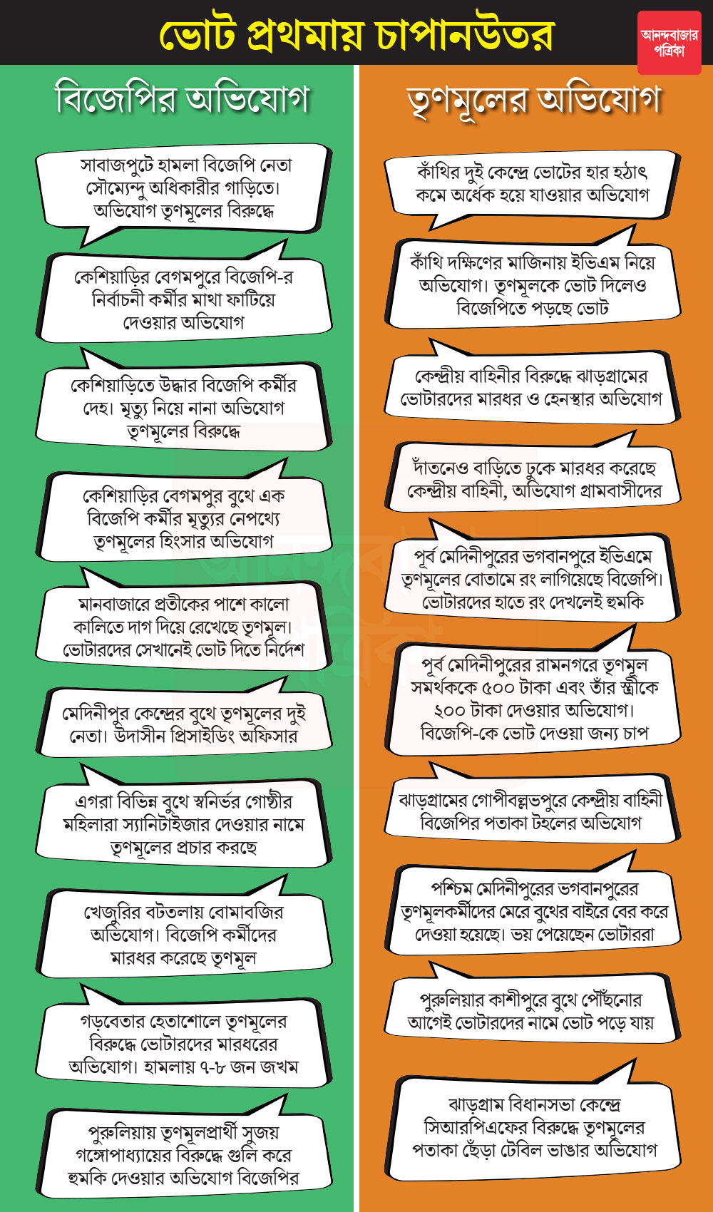 বিক্ষিপ্ত কিছু ঘটনার কথা উল্লেখ্য করলেও, নানা অভিযোগে সরগরম ছিল প্রথম দফার ভোটগ্রহণ পর্ব। কমিশনের কাছে ৬২৭টি অভিযোগ এসেছে। তা খতিয়ে দেখা হচ্ছে। কেন্দ্রীয় বাহিনীর বিরুদ্ধে হুমকি দেওয়া, এমনকি, মারধরের অভিযোগ করেছেন ভোটাররা। যদিও কমিশনের কাছে তেমন কোনও তথ্য নেই বলে দাবি করেছেন আধিকারিকেরা। আরিজ আফতাব বলেন, “এ বিষয়ে খোঁজ নিয়ে তদন্ত করে দেখা হবে। ছাতনার বুথ নম্বর ৫, ৫০ এবং রানিবাঁধের ১২ নম্বর বুথে ভোট বয়কটের ঘটনা ঘটেছে। বিক্ষিপ্ত কিছু ঘটনা ছাড়া নির্বাচন শান্তিপূর্ণভাবেই মিটেছে।”