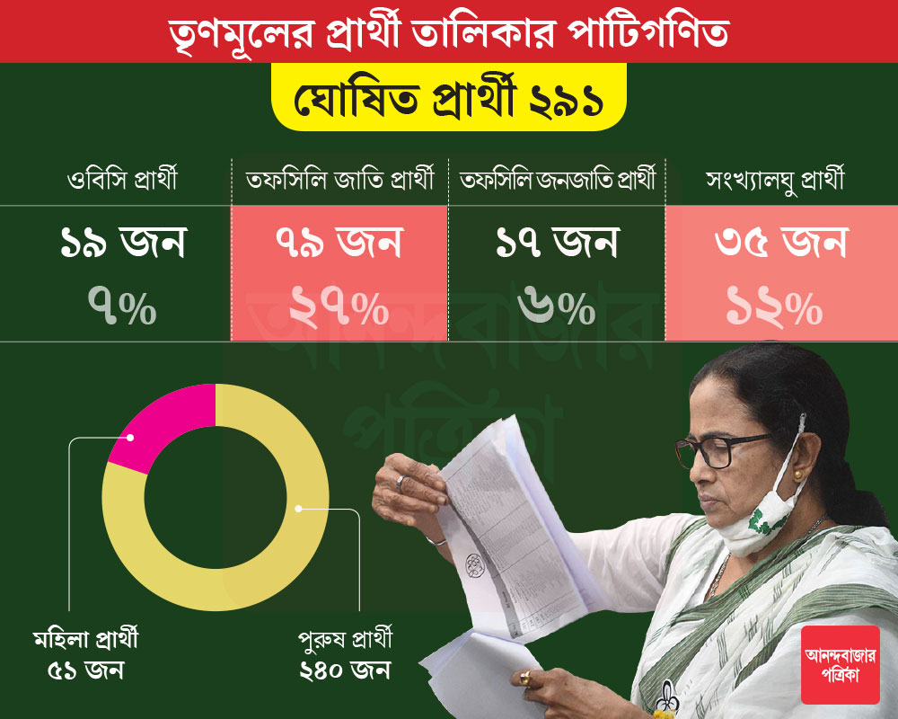 তৃণমূলের দেওয়া হিসাব অনুযায়ী, মোট ৭৯ জন তফসিলি জাতির প্রার্থী রয়েছেন তৃণমূলের তালিকায়। গত বার ছিলেন ৬৮ জন। তফসিলি জনজাতির প্রার্থী রয়েছেন ১৭ জন। গত বার ছিলেন ১৬ জন। এ ছাড়াও অন্যান্য অনগ্রসর শ্রেণির প্রার্থী ১৯ জন। শতাংশের হিসেবে তফসিলি জাতি, জনজাতি এবং অন্যান্য অনগ্রসর শ্রেণি যথাক্রমে ২৭, ৬ ও ৭। একইসঙ্গে ৩৫ জন সংখ্যালঘুকে প্রার্থী করা হয়েছে। মোট প্রার্থীর ১২ শতাংশ। তালিকা অনুযায়ী পুরুষ প্রার্থী ২৪০ জন (৮২ শতাংশ) এবং মহিলা প্রার্থী ৫১ জন (১৮ শতাংশ)।