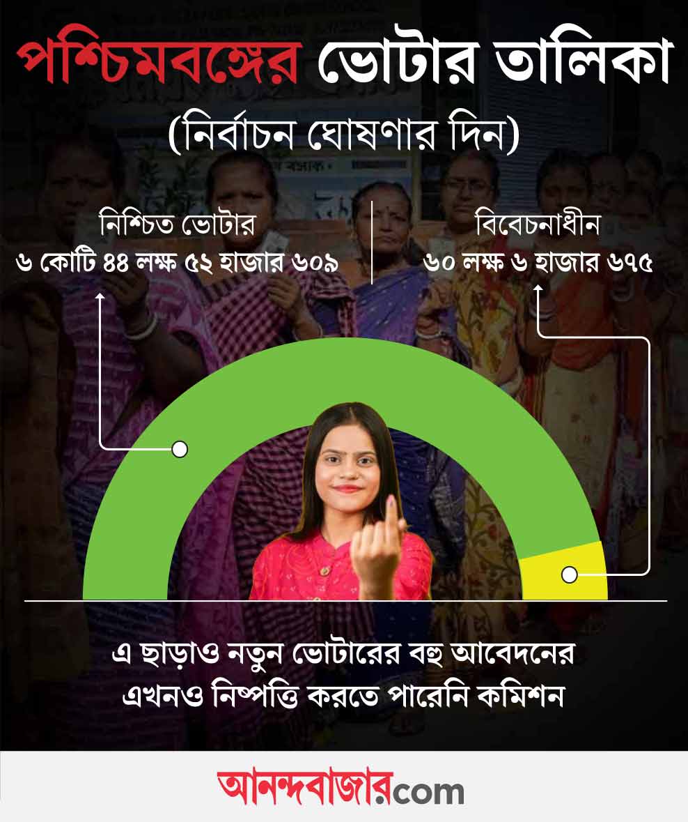 রাজ্যের মুখ্য নির্বাচনী আধিকারিকের (সিইও) দফতর সূত্রে জানা গিয়েছে, পশ্চিমবঙ্গে এ বার আগের চেয়ে কম দফায় ভোট হবে। নববর্ষের পর (১৫ এপ্রিলের পর) প্রথম দফার ভোটের দিন ধার্য হতে পারে। তার মধ্যে ‘বিবেচনাধীন’ সকলের নামের নিষ্পত্তি হবে কি না, যদি না হয়, সে ক্ষেত্রে তাঁরা ভোট দিতে পারবেন কি না, এখনও স্পষ্ট নয়। পূর্ণাঙ্গ ভোটার তালিকা যে কোনও নির্বাচনের প্রাথমিক শর্ত। ঝুলে থাকা ভোটার তালিকা নিয়ে ভোট হতে পারে না। সে ক্ষেত্রে চূড়ান্ত সিদ্ধান্ত নিতে হবে সুপ্রিম কোর্টকেই। ভোটঘোষণার পরেই বিষয়টি ফের আদালতে উঠতে পারে।