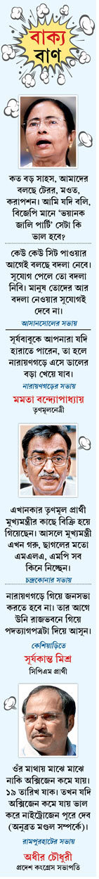 নারায়ণগড়ের সভা সেরে মমতা চলে যান আসানসোলে। কিন্তু তাঁর কপ্টার উড়ে যাওয়ার পরেও মাঠ জুড়ে ছড়িয়ে ছিল গুঞ্জন! জোটের দাপটে তা হলে কি এখন আশঙ্কা তাড়া করে বেড়াচ্ছে তৃণমূল নেত্রীকে? গলা উঁচিয়ে প্রচারের পরেও কি মনে ভয় থেকে যাচ্ছে— লোকে মানছে তো! সারদা, নারদ থেকে উড়ালপুল বিপর্যয়, একের পর এক ধাক্কায় গোটা দল দিশাহারা। একান্ত আলোচনায় সে কথা কবুল করছেন তৃণমূল নেতারাই। তাঁদের একাংশের মতে, সেই বেহাল দশারই প্রতিফলন ঘটছে দলনেত্রীর বক্তৃতায়। কোথায় আক্রমণ, কোথায় রক্ষণ, সবই যেন তাল পাকিয়ে যাচ্ছে তাঁর।