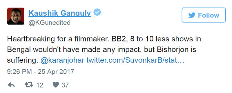 কৌশিকবাবু বলছেন, ‘আমার ছবি ভাল ব্যবসা করছিল। ছুটির দিনগুলো ছাড়াও অন্যান্য দিনে প্রায় ৬০ শতাংশ প্রেক্ষাগৃহে ‘বিসর্জন’ রমরমা ব্যবসা করেছে। ১৪ এপ্রিল মুক্তি পাওয়ার পর থেকেই এক দিকে যে রকম সমালোচকদের নজর কেড়েছে, তেমনই বাণিজ্যিক ভাবেও সফল ‘বিসর্জন’। রিলিজের প্রথম সপ্তাহেই ‘বিসর্জন’-এর রোজগার ৩০ লক্ষ ৬৯ হাজার ১৮৬ টাকা, যেখানে মোটের উপর ২১২টি শো চলেছে এই কম বাজেটের ছবির। পরিচালকের দাবি, ‘আঞ্চলিক ছবির নিরাপত্তা প্রয়োজন। প্রত্যেক সপ্তাহেই বলিউডের বিগ বাজেটের ছবি মুক্তি পায় এবং পাবে। কিন্তু যে ভাবে ‘বাহুবলী ২’ প্রেক্ষাগৃহ দখল করছে, সেটা খুবই দুর্ভাগ্যজনক।’