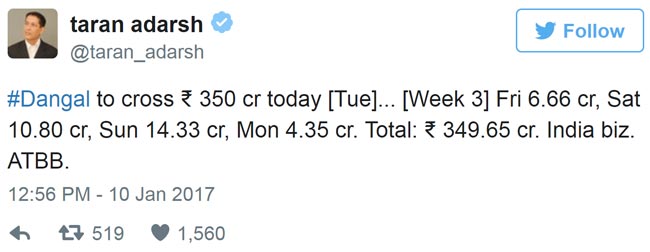 ফিল্ম সমালোচক এবং বলিউড বাজার বিশ্লেষক তরণ আদর্শ টুইট করে জানিয়েছেন, ‘সুলতান’, ‘ধুম ৩’, ‘বজরঙ্গি ভাইজান’, ‘পিকে’— সব সিনেমাকেই পেছনে ফেলে আয়ের বিচারে ভারতীয় সিনেমার ইতিহাসে ‘দঙ্গল’ একে। দেশীয় বাজার থেকেই প্রায় ৩৫০ কোটি টাকার ব্যবসা করেছে ছবিটি।