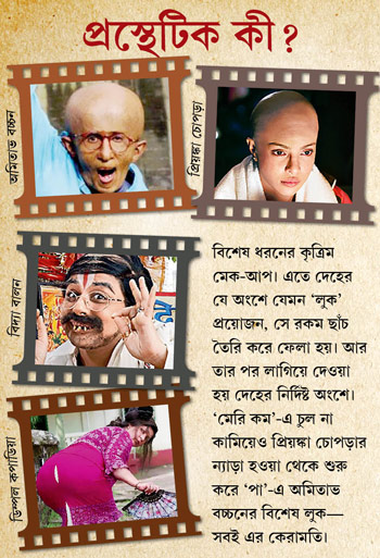 বলিউডের নায়িকারা মূলধারার ছবির জন্য এই ধরনের ঝুঁকি আগে বড় একটা নেননি। ১৯৮১-তে সঞ্জীবকুমার প্রস্থেটিক্সের ব্যবহার করেছিলেন ‘চেহরা পে চেহরা’ ছবিতে। দক্ষিণী এবং হিন্দি সিনেমায় তাঁর লুক নিয়ে যথেষ্ট পরীক্ষা করেছেন কমল হাসন। ‘চাচি ৪২০’, ‘দশাবতারম’ থেকে ‘বিশ্বরূপম’ সব ছবিতেই কমল দর্শকদের চমকে দিয়েছেন। প্রত্যেক দিন শু্যটিংয়ের সময় অমিতাভ বচ্চনকে প্রায় পাঁচ ঘণ্টা একটানা প্রস্থেটিক্স ব্যবহার করতে হয়েছে ‘পা’-তে অরোর চরিত্রে অভিনয় করার জন্য। শোনা যাচ্ছে যে ‘১০২ নট আউট’ ছবির জন্যও অমিতাভ আবার সেই প্রস্থেটিক মেক আপ ব্যবহার করবেন। এ বার ১০২ বছরের এক বৃদ্ধের চরিত্রে অভিনয় করার জনই সেই প্রস্তুতি।
