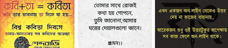 এখন তো আর শুধু কম্পিউটার বা ল্যাপটপে নয়। ফোনেও সারাদিন অনবরত আপডেট! স্ক্রিন থেকে চোখ সরানোরও জো নেই। নিন্দুকেরা বলে থাকেন, ফেসবুক-প্রজন্ম বড় অসামাজিক। কিন্তু এ খেয়াল কি তাঁরা রাখেন, মিনিটে-মিনিটে কত গভীরে ঢুকে বাংলা ভাষার খনি খুঁজে আনা চলছে হরদম! সুকুমার রায় থেকে বিভূতিভূষণ। কমলকুমার থেকে জীবনানন্দ। সকলের সৃষ্টি নিয়ে চলছে তুমুল আলোচনা। ‘কবিতার গাছ’-এ চলছে প্রিয় কবির কাব্যপাঠ। ‘রসেবশে’তে প্রিয় পঙক্তি, উদ্ধৃতি নিয়ে আড্ডা। বিষয়ের কোনও বাউন্ডারি নেই সত্যিই। এই যে সদ্য বিয়ে হয়ে গেল প্রীতি জিন্টার। কতশত প্রাণে ঘা দিয়ে গেল সেই খবর! ‘বং পেন’-এ (যেটা তন্ময় মুখোপাধ্যায়ের ব্লগ) অমনি লেখা হল, ‘‘-অত মন দিয়ে কী লিখছিস? - চিঠি। - কাকে? - প্রীতিকে। - মুন্সী?- চিন্তা। - হেহ। ফ্যান লেটার। - নাহ। মন ভাঙার হিসেব। দড়াম করে বিয়ে করে ঠিক করেনি। চারটে কথা লিখতেই দতো প্রী-কে। - আদিখ্যেতা। - কেন? - গা জ্বলে যায়। - কেন? - এ চিঠি লিখে কী হবে? - অপটিমিজম। - গাধামো। - আমি তোর ইকনমি পাল্টাতে চেয়ে ভোট দেওয়াকে গাধামো বলেছি কখনও?’’