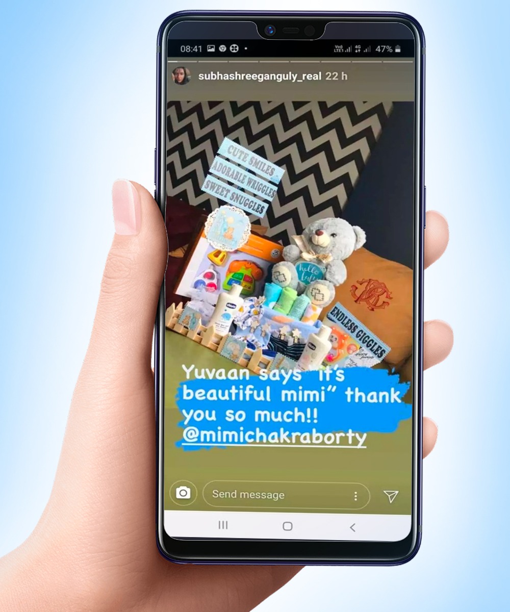 নিজের ইনস্টা স্টোরিতে মিমির পাঠানো উপহারের ছবি শেয়ার করে ছেলের জবানিতে মিমিকে আন্তরিক ধন্যবাদ জানিয়ে শুভশ্রী লেখেন, ‘‘ইউভান বলছে, উপহার খুব সুন্দর। থ্যাঙ্ক ইউ সো মাচ মিমি!’’ ছবি বলছে, টেডি বিয়ার, খেলনা ছাড়াও সেই গিফট প্যাকে রয়েছে, জামা, তোয়ালে। এ ছাড়াও, ইউভানকে সাজাতে মিমি পাঠিয়েছেন, বেবি পাউডার, ক্রিম, তেল, সাবান, শ্