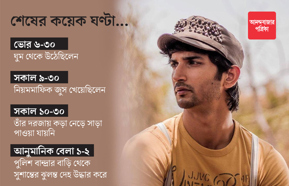 ‘সুইসাইড ইজ় নট দ্য সলিউশন’... বড় পর্দায় তাঁর শেষ মুক্তিপ্রাপ্ত ছবি ‘ছিছোরে’র এই সংলাপটি যেন ফিরে আসছিল এ দিন। শনিবার রাতেও ছেলের সঙ্গে ফোনে কথা বলেছিলেন সুশান্তের বাবা। পরিবার, প্রতিবেশী, বন্ধু, সহকর্মীদের প্রায় কেউই আঁচ পাননি, বিগত কয়েক মাস ধরে অবসাদের সঙ্গে লড়াই এত কঠিন হয়ে গিয়েছে সুশান্তের। একতা কপূরের শেয়ার করা স্ক্রিনশটে উঠে এসেছে, এক সপ্তাহ আগেও কাজ নিয়ে কথা বলেছেন তাঁরা। এ বছর কোনও নতুন ছবিতে সই করেননি অভিনেতা। তবে অফার কম ছিল না তাঁর হাতে, বিশেষ করে শেষ ছবি ‘ছিছোরে’ হিট হওয়ার পরে। মাসকয়েক আগে ভাড়া নেওয়া নতুন ফ্ল্যাটে একাই থাকতেন সুশান্ত, মাসিক ভাড়া ছিল ৪.৫১ লক্ষ টাকা। লকডাউনে কখনও এক্সারসাইজ়, কখনও কম্পিউটার প্রোগ্রামিংয়ের নতুন কোডিং শেখা, আবার কখনও নিজের প্রিয় টেলিস্কোপে চোখ রাখার নানা পোস্টে ভরে ছিল তাঁর ইনস্টাগ্রাম। তবে গত ৩ জুনের পর থেকে আর কোনও পোস্ট করেননি সুশান্ত। সেই পোস্ট ছিল তাঁর মাকে নিয়ে। ২০০২ সালে মাকে হারানোর পরে জীবন ওলটপালট হয়ে গিয়েছিল তাঁর।