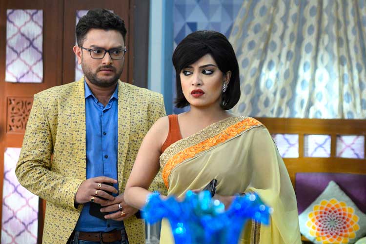 সেটে ঢুকতেই ঘাবড়ানোর পালা। কিছুই ঠাহর করা যাচ্ছে না। ঘুটঘুটে অন্ধকারে ইতিউতি ঘুরে বেড়াচ্ছে কয়েকটি ছায়ামূর্তি। অন্ধকারের মধ্য দিয়ে কিছুটা এগিয়ে যেতেই একটা ঘর থেকে আলো ভেসে এল। সে দিকে আর একটু যেতেই ‘শ্যামা’র বাড়ির বসার ঘর, খানিক দূরে ডাইনিং হল। সেখানে কাজ চলছে। দু’জন মানুষ চটজলদি পাল্টে ফেলছেন কার্পেট, পর্দা ইত্যাদি। আরও দু’জনে সেট করছেন আলো। কিন্তু অভিনেতাদের কারও দেখা পাওয়া গেল না।