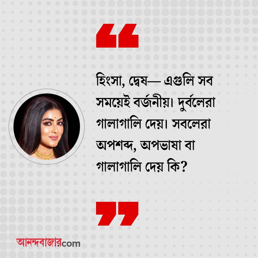 গার্গী: শুধু রাজনীতি কেন? কোনও জায়গাতেই অপশব্দের প্রয়োজন আছে বলে আমি অন্তত অনুভব করি না। আমার মতে, এই ধরনের ভাষাপ্রয়োগ অনুচিত। হিংসা, দ্বেষ— এগুলি সব সময়েই বর্জনীয়। দুর্বলেরা গালাগালি দেয়। সবলেরা অপশব্দ, অপভাষা বা গালাগালি দেয় কি?