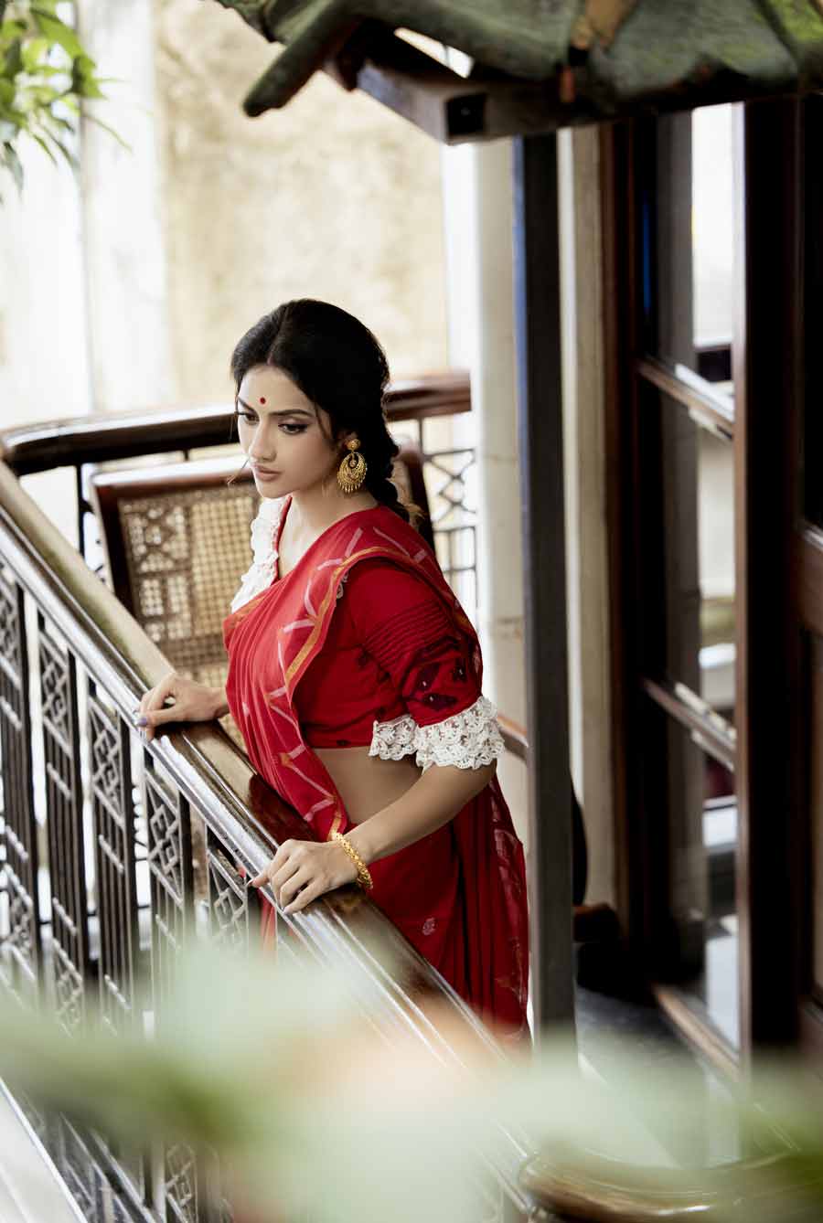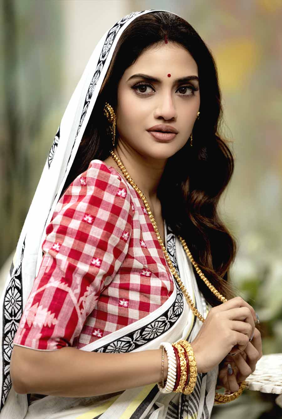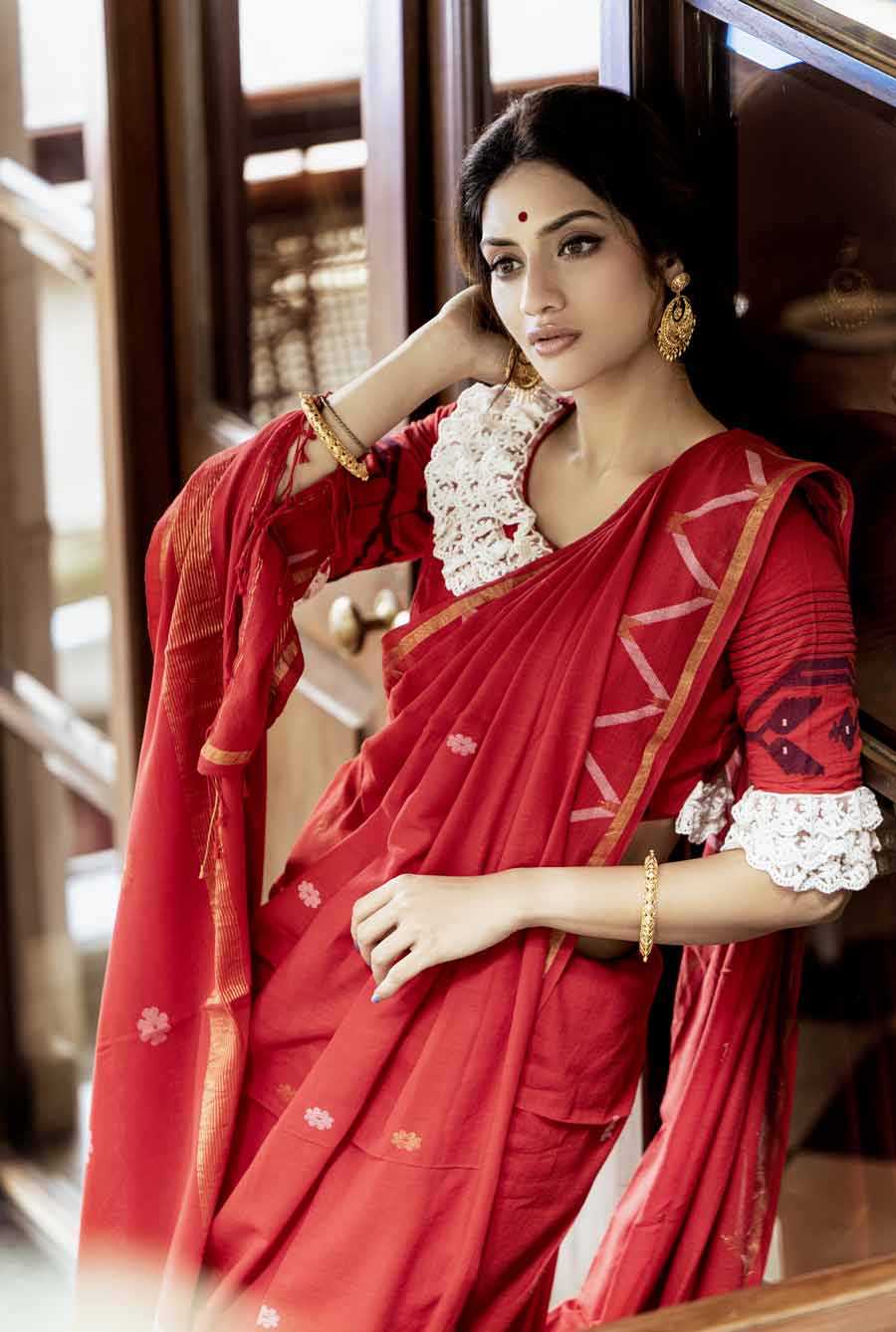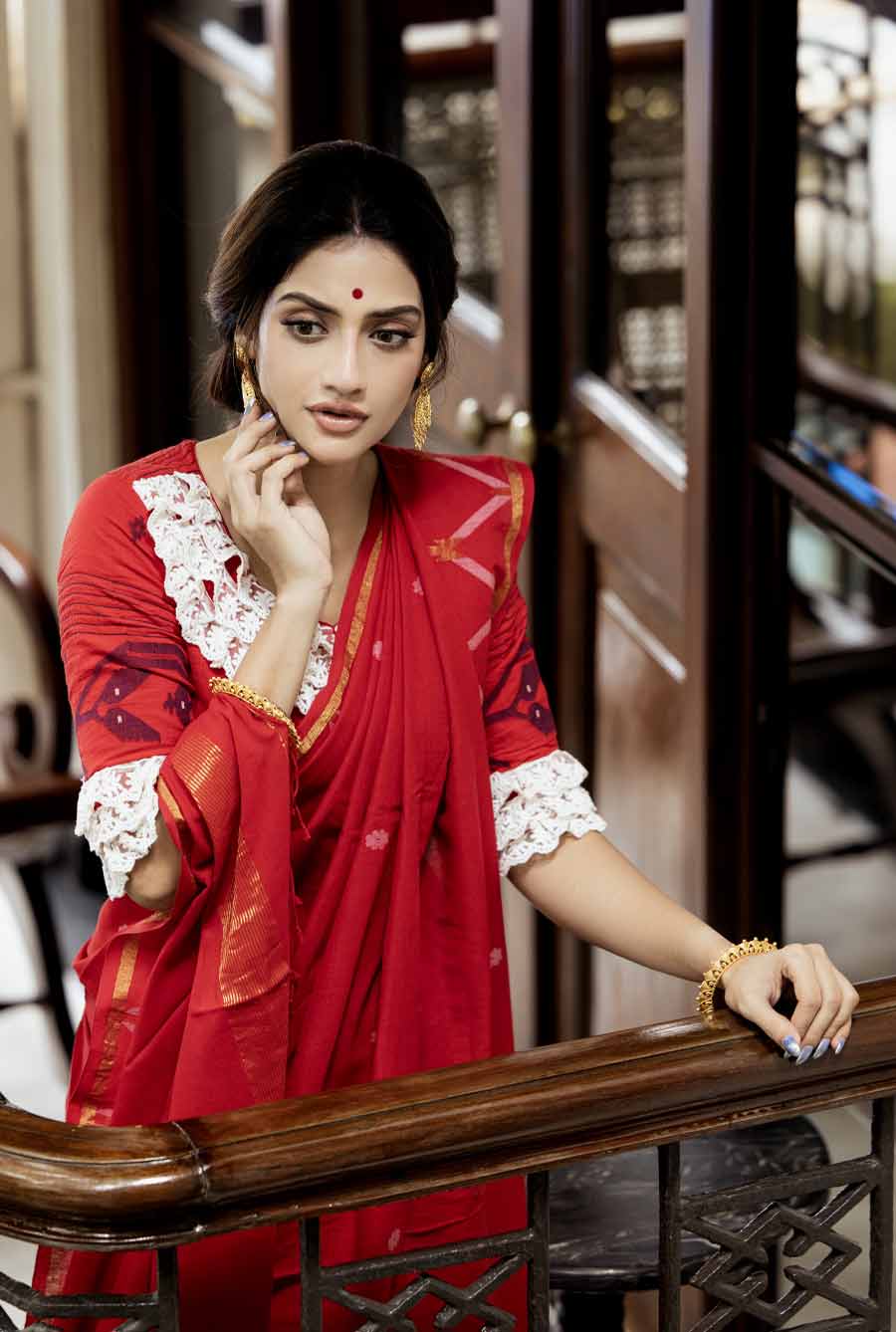 কপালে লাল টিপ, বিনুনি ঝোলানো, লাল সুতির শাড়ির সঙ্গে মানানসই ক্রুশের কাজ করা পুরনো কায়দায় তৈরি ব্লাউজ। দক্ষিণ কলকাতার একটি ক্যাফেতে ‘ফটোশুট’-এর মাঝে পুজোর পরিকল্পনা, ছেলের নানা বায়নার কাহিনি অনর্গল বলে চললেন অভিনেত্রী। রূপসজ্জার মাঝে, ফোনে ছেলেকে দেখে নিচ্ছিলেন। ছোট্ট ঈশান কী করছে, তা সারা ক্ষণ মাথায় চলে মা নুসরতের।