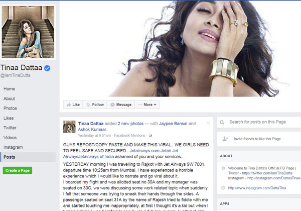 ফেসবুকে টিনা লিখেছেন, ‘‘…জেট এয়ারওয়েজের বিমানে ভয়ঙ্কর অভিজ্ঞতা হল আমার। রাজেশ নামে এক সহযাত্রী আমাকে খারাপ ভাবে ছোঁয়ার চেষ্টা করেন ক্রমাগত। আমি বিষয়টি এয়ারহোস্টেসদের জানাই। কিন্তু ওঁরা কোনও ব্যবস্থাই নেননি। আমি ক্যাপ্টেনকেও জানাই। কিন্তু তিনিও ভাল ব্যবহার করেননি। বরং আমাকে বলেন, বিমান টেক অফ করার আগে পর্যন্ত কোনও ঘটনার দায় তাঁদের নয়। আমি জানতে চেয়েছিলাম, আপনার পরিবারের কারও সঙ্গে এমন হলেও কি এভাবে কথা বলতেন? আমি আসন পরিবর্তন করে দেওয়ার অনুরোধ জানাই। কিন্তু তাতেও কোনও লাভ হয়নি।…’’