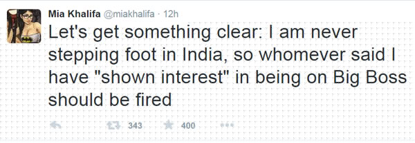২০১১-য় প্রথম ‘বিগ বস’এ পর্ন তারকা হিসাবে সানি লিওনকে দেখেছিলেন দর্শকরা। শোনা গিয়েছিল, রেকর্ড পরিমাণ অর্থের বিনিময়ে তাঁদের আসন্ন সিজনে লেবানিজ-আমেরিকান পর্ন তারকা মিয়াকে আনার চেষ্টা করছিলেন ‘বিগ বস’এর প্রযোজকেরা। ২২ বছরের এই পর্ন তারকা -য় তাঁর কেরিয়ার শুরু করেছেন। আর এর মধ্যেই তিনি পৌঁছে গিয়েছেন এক নম্বরে। কিন্তু দর্শকদের সেই আশায় জল ঢেলে দিলেন খোদ মিয়াই।