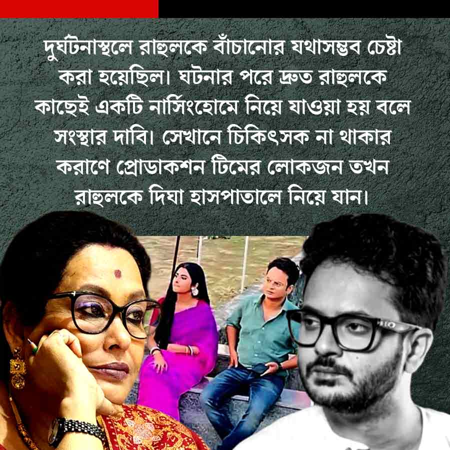 রাহুলের মৃত্যুর কারণ ঘিরে যে সব খবর চারদিকে ঘুরছে তার সবটা সত্যি নয় বলেই দাবি সংস্থার। তারা জানিয়েছে, শুটিং ইউনিটের লোকজনের তরফে ওই মুহূর্তে দুর্ঘটনাস্থলে রাহুলকে বাঁচানোর যথাসম্ভব চেষ্টা করা হয়েছিল। ঘটনার পরে দ্রুত রাহুলকে কাছেই একটি নার্সিংহোমে নিয়ে যাওয়া হয় বলে সংস্থার দাবি। সেখানে চিকিৎসক না থাকার কারণে প্রোডাকশন টিমের লোকজন তখন রাহুলকে দিঘা হাসপাতালে নিয়ে যান।