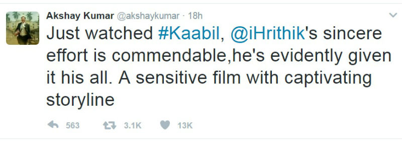 বাড়ি ফিরেই টুইটার পোস্টে সে কথা জানালেন এই সেলেব দম্পতি। টুইটারে অক্ষয় লেখেন, ‘‘এইমাত্র কাবিল দেখলাম। এই ছবিতে হৃতিকের আন্তরিক প্রচেষ্টা ভীষণ প্রশংসনীয়।’’ টুইঙ্কলও প্রশংসা করেন হৃতিকের।