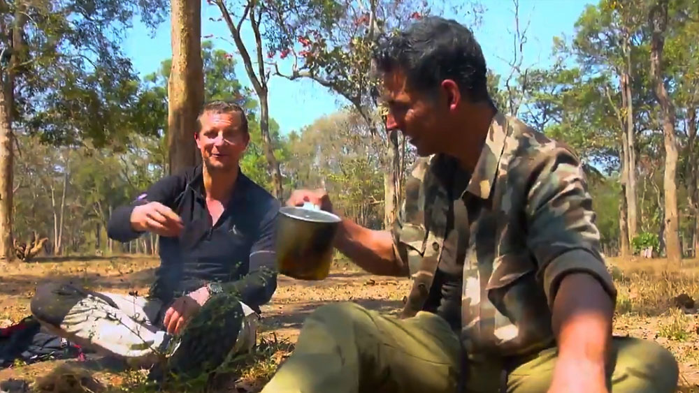 গভীর জঙ্গলে শুটিংয়ের ফাঁকে এমন কথোপকথনের ফাঁকেই গোমুত্রের কথা বলেন অক্ষয় কুমার।
