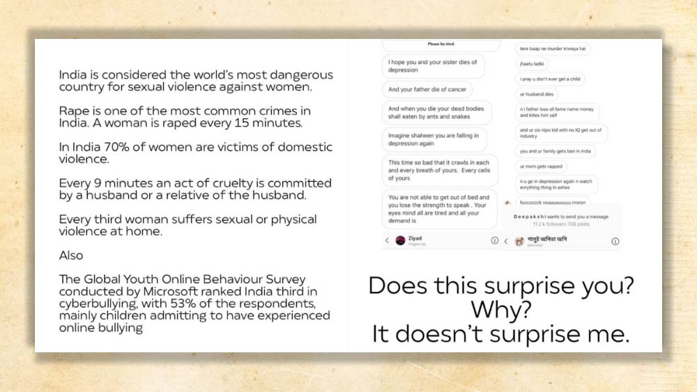 আলিয়া চুপ করে থাকলেও, মুখ খুলেছেন শাহিন। তিনি লেখেন, “ভারতে প্রতি ১৫ মিনিটে একজন মহিলা ধর্ষিত হন। ৭০ শতাংশ মহিলা গার্হস্থ্য হিংসার শিকার। সেখানে আমাদের উপর এরকম আক্রমণে আপনি বিস্মিত? আমি নই।“