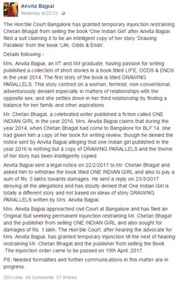 ২০১৬-র ২২ ফেব্রুয়ারি তিনি চেতনকে ওই বইয়ের সার্কুলেশন বন্ধ করতে একটি আইনি নোটিসও পাঠিয়েছিলেন। সঙ্গে ক্ষতিপূরণ বাবদ ৫ লাখ টাকার দাবি জানান তিনি। কিন্তু, চেতন তা মানতে চাননি বলে অভিযোগ। শেষমেশ বেঙ্গালুরুর একটি আদালতে যান ওই লেখিকা।