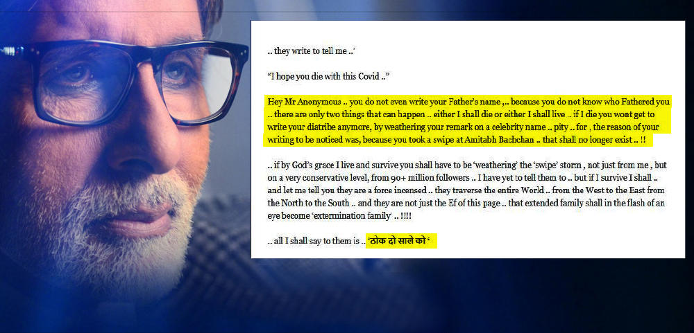 নিজের ব্লগে সেই ব্যক্তির উদ্দেশে অমিতাভের কড়া জবাব, “মিস্টার অ্যানোনিমাস, তোমার বাবার নামও তো দেখছি লেখা নেই। মনে হয় তুমি জানই না তোমার বাবা কে? দু’টো জিনিস হতে পারে। হয় আমি বাঁচব, না হয় মরে যাব। যদি মরে যাই, তবে এই কুৎসিত কথাগুলো লেখার আর লোক পাবে না। করুণা হয় তোমার জন্য…।”