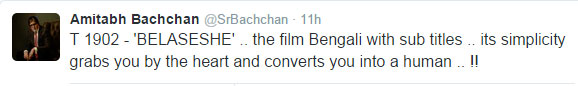 দিল্লি যাওয়ার আগে তিনি বলেন, “বেলাশেষে-র জন্য শুধু নয়, সমগ্র বাংলা ছবির জন্য অমিতাভ বচ্চনের এই টুইটটা ভীষণ গুরুত্বপূর্ণ। আই অ্যাম ওভার দ্য মুন।”