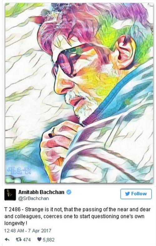 বিগ বি তাঁর টুইটে লিখেছেন, “কি অদ্ভুত না, নিজের প্রিয়জনের বা সহকর্মীর চলে যাওয়ার ঘটনা নিজের আয়ু নিয়ে ভাবতে বাধ্য করে।” সরাসরি বিনোদ খন্নার নাম না নিলেও অমিতাভ বচ্চনের এই টুইট সত্তর বছরের অসুস্থ অভিনেতা বিনোদ খন্নার মৃত্যু নিয়ে জল্পনা আরও বাড়িয়ে দিয়েছে। তা হলে কি সত্যিই আমাদের মধ্যে আর নেই বিনোদ খন্না! নিজের প্রিয়জনের বা সহকর্মী বলতে কি তা হলে বিনোদ খন্নার কথাই বলেছেন অমিতাভ? এ প্রশ্নের উত্তর এখনও মেলেনি।