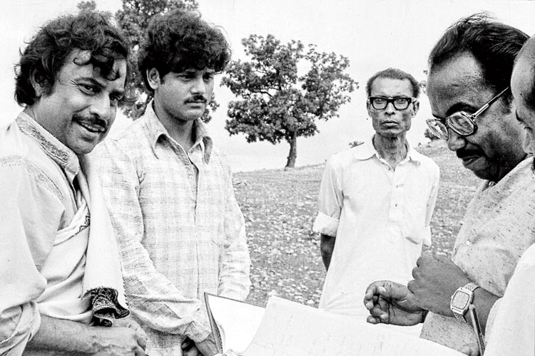 সেদিন: শিমুলতলায় ‘দাদার কীর্তি’ ছবির শুটিংয়ে পরিচালকের সঙ্গে অনুপকুমার এবং তাপস পাল। ফাইল চিত্র