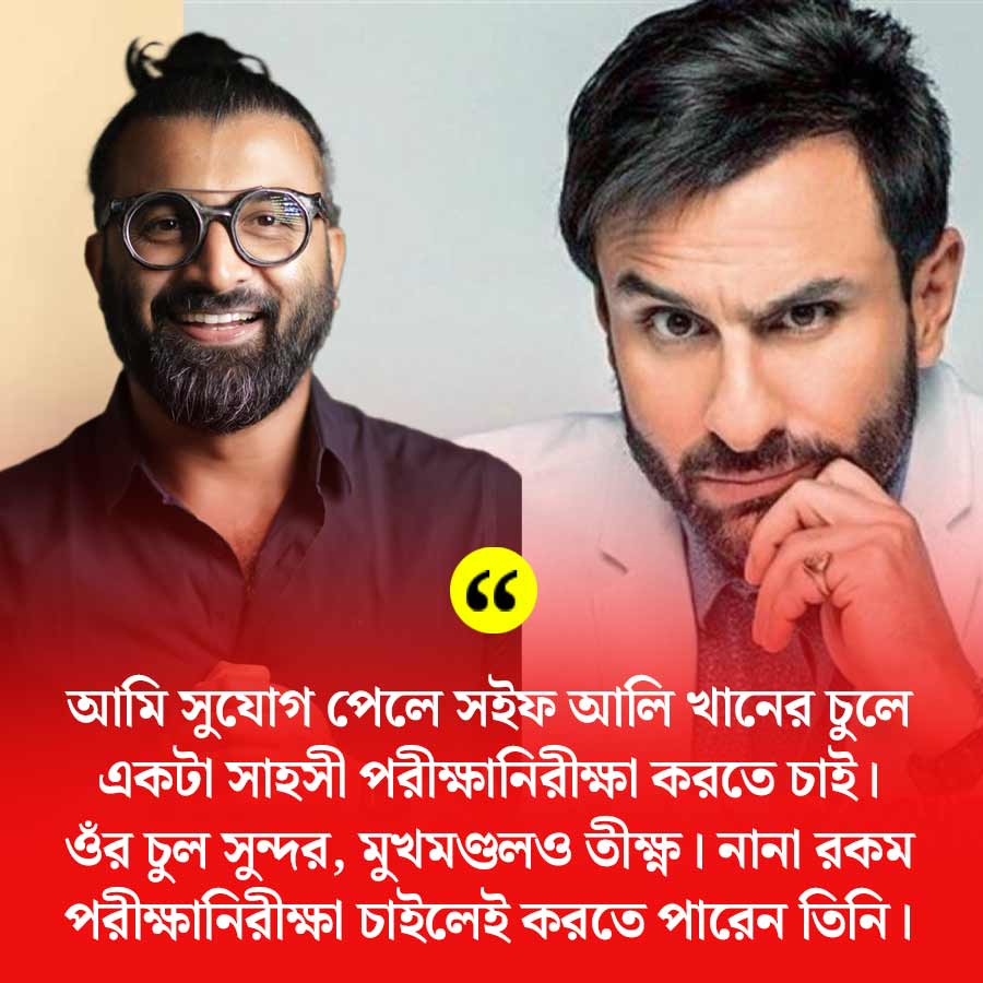 দর্শন: আমি সুযোগ পেলে সইফ আলি খানের চুলে একটা সাহসী পরীক্ষানিরীক্ষা করতে চাই। ওঁর চুল সুন্দর, মুখমণ্ডলও তীক্ষ্ণ। নানা রকম পরীক্ষানিরীক্ষা চাইলেই করতে পারেন তিনি। ওঁর জন্য আমার পছন্দ ‘রক-পাঙ্ক মোহক’ অথবা ‘শেভড আন্ডারকাট’। খুবই অন্য রকম। কিন্তু আমি নিশ্চিত, ওঁর ব্যক্তিত্বের সঙ্গে মানানসই।