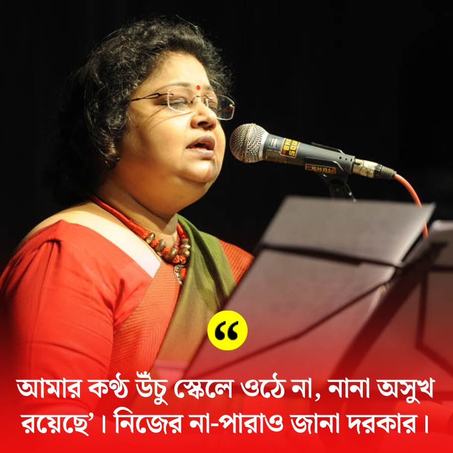 শ্রাবণী: আমার বহু না পারা রয়েছে। প্রথমত, আমি রোগের আগার। মাথা থেকে পা পর্যন্ত রোগ। মাঝে মাঝেই কুপোকাত হই। তার পর আবার উঠে দাঁড়াই। এই সবের জন্য আমার গলার রেঞ্জ নিচুর দিকে। খুব উঁচু স্কেলে আমি গাইতে পারি না। চেহারাও ভারী। দমও নেই। এগুলো মাথায় রেখেই কিন্তু আমি গানের নির্বাচন করি। এগুলো জানলে গান গাইতে সুবিধেই হয়।