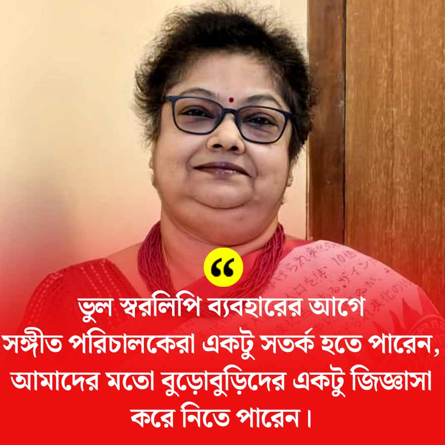 শ্রাবণী: হ্যাঁ। এ জন্যই সঙ্গীত পরিচালকদের আর একটু সতর্ক হওয়া উচিত। প্রয়োজন হলে আমরা যারা বুড়োবুড়ির দল (হেসে), তাঁদের একটু জিজ্ঞাসা করে নেওয়া উচিত। এখন তো একটা গান শোনার বিভিন্ন মঞ্চ। ঠিক গানটা শুনিয়ে নিলেই হয়ে যায়।
