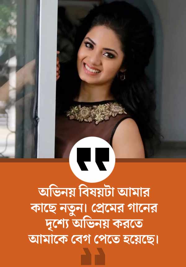 অন্বেষা: কোনও অভিনয় প্রশিক্ষণের স্কুলে যাইনি। কাজটা এসেছে হঠাৎ করে। আসলে ছবির সঙ্গীতের কাজ দিয়েই শুরু করেছিলাম। আগে গান তৈরি হয়েছে। পরে অভিনয়ের বিষয়টা এসেছে। শুটিং-এর আগে ঘষামাজা হয়েছে। যারা অভিনয় করেছি, নিজেদের মধ্যে মহড়া দিয়েছি। প্রযোজনা সংস্থা থেকে সাহায্য করা হয়েছে। প্রযোজক-পরিচালক দেখতেন এসেছেন। প্রেমের গানের দৃশ্যে অভিনয় করতে আমাকে বেগ পেতে হয়েছে। পরিচালক বলতেন, “নায়ক কাছে এলেই আড়ষ্ট হয়ে যাচ্ছ। এমন করলে কী ভাবে হবে?” যদিও এখন গানগুলির ভিডিয়ো দেখে মানুষ তেমন প্রতিক্রিয়া দিচ্ছে না। আমার ছবির নায়ক ইকবালও খুব সহযোগিতা করেছেন।