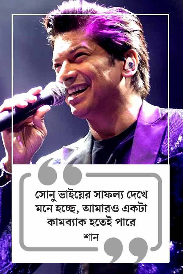 শান: হ্যাঁ অসাধারণ একটা গান গেয়েছে সোনুভাই। কামব্যাক তো একমাত্র সোনু নিগমই করেছে! (হাসি) ও যাদের একসময় ‘মিউজ়িক মাফিয়া’ বলেছিল, তাঁরাই ওকে কাজ দিয়েছেন। এই জন্য ব্যক্তিগত ভাবে কোনও কিছু গ্রহণ না করাই ভাল। কেউ শত্রু নয়। আমি তখনও বলেছিলাম, সবই বাণিজ্যকে ঘিরে। সোনুর অসংখ্য অনুরাগী। মিউজ়িক কোম্পানিগুলোও সেটা বুঝেছে যে, সোনুকে দিয়ে গাওয়ালে, ওর অসংখ্য অনুরাগী গানটা শুনবেন। সবই ব্যবসার উপর নির্ভর করছে। আমি যদি বলি, ‘কাল থেকে গান গাইব না’। তার পরের দিনই একটা দারুণ সুযোগ এলে কি আমি গানটা গাইব না? সোনুভাইয়ের সাফল্য দেখে আমারও মনে হচ্ছে, আমারও একটা কামব্যাক হতে পারে (হাসি)।