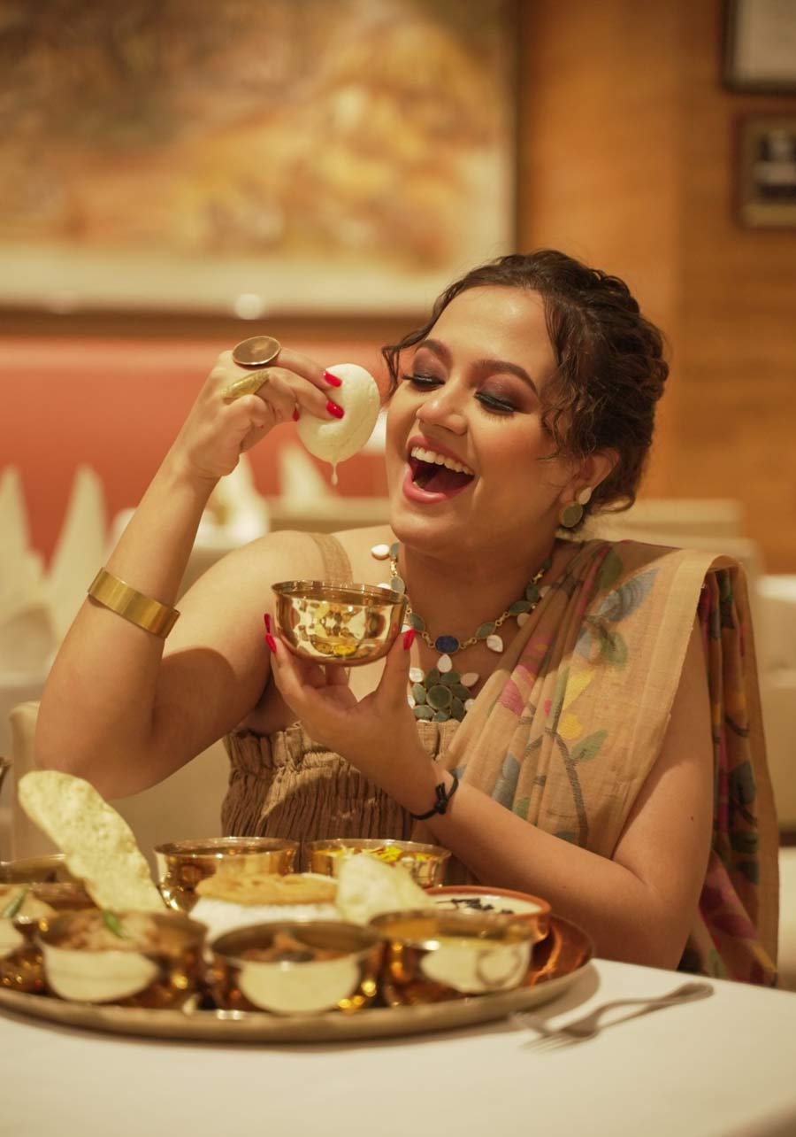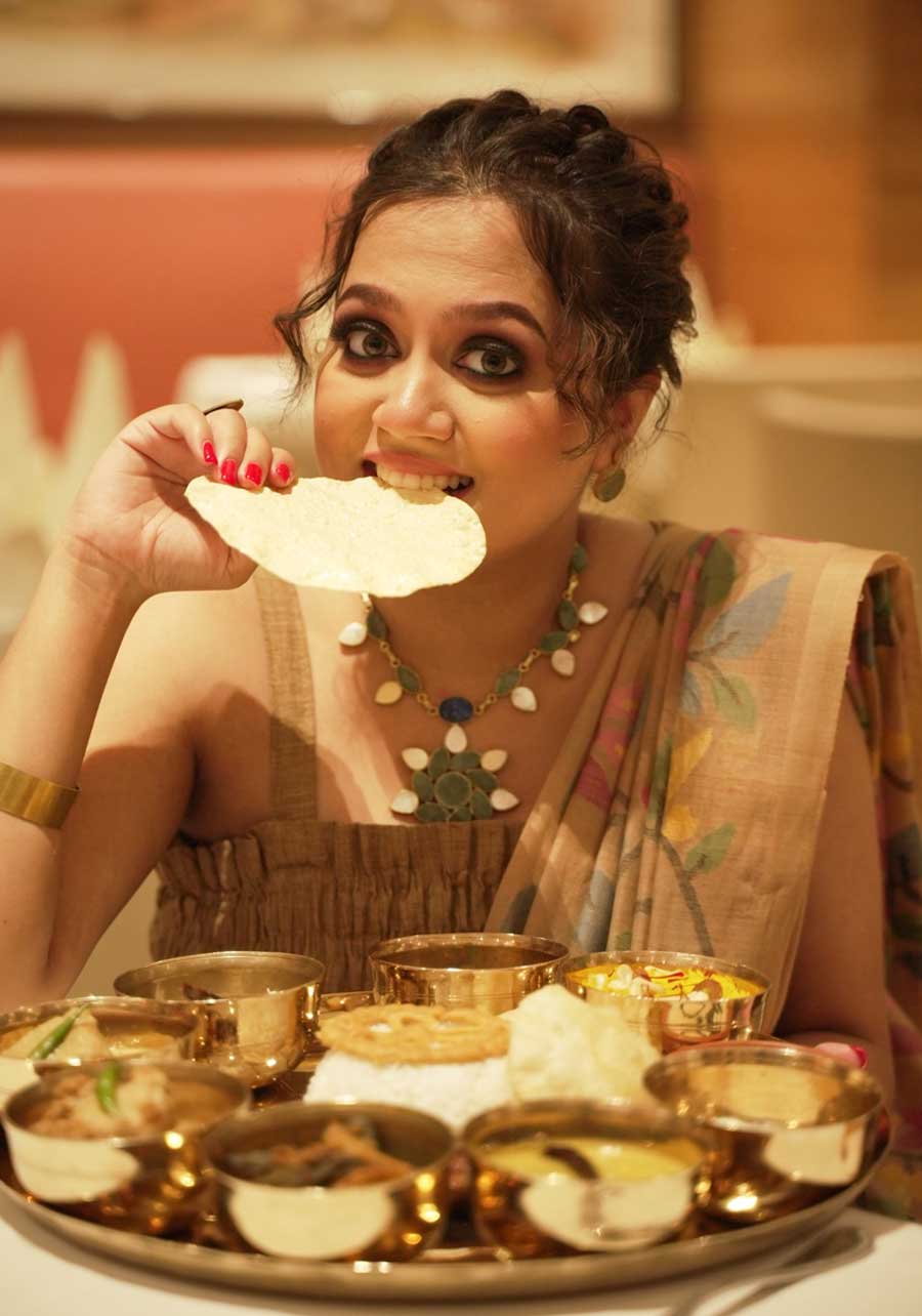 রং মিলিয়ে এই শাড়ির সঙ্গে অহনা পরেছিলেন করসেট ধাঁচের ব্লাউজ়। তার সঙ্গে মানানসই গয়না। সাধের থালা দেখেই মুগ্ধ অহনা। আমিষ খাবার খান অহনা। তবে নিরামিষও পছন্দ তাঁর। প্রথমেই তাই বেগুন ভাজা দিয়ে শুরু করলেন। তার পরে মোচার ঘণ্ট খেলেন চেটেপুটে।