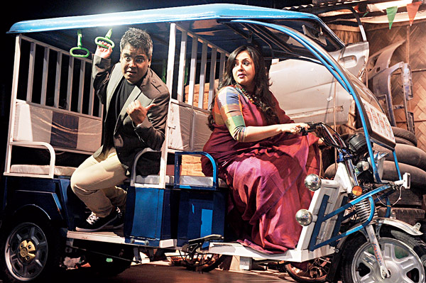 আ যা মেরি টোটো মে: ‘মীরাক্কেল’য়ের সেটে টোটো। সওয়ারি মীর ও শ্রীলেখা।ছবি: কৌশিক সরকার।